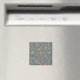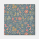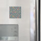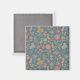 This magnet features stylised flowers in shades of coral and olive green on a denim blue background.