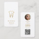 Introducing the ultimate symbol of professionalism and sophistication - the Elegant MINIMALIST MODERN DENTIST White Gold TOOTH business card. With its stunning gold tooth logo, round photo, qr code, and customisable text in opulent gold, this card exudes elegance and refinement.