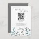 This simple modern garden greenery wedding RSVP and Details card with QR Code features a watercolor damselfly/dragonfly in shades of blue and green with iridescent wings. It is resting on a simple arrangement of natural watercolor garden greenery in shades of green, blue, grey and brown with a white background. The back is a solid grey that matches the text. Just add your wedding website URL, so your guests can scan the QR Code and easily respond and view all of your wedding details.