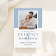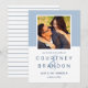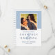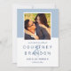 A crisp and contemporary two-sided save the date featuring a soft dusty blue colour block framing a square engagement photo, with bold navy names and clean typography on a white lower panel. The coordinating navy striped back adds a refined nautical touch. The blue-on-white palette creates a fresh, timeless look suited to coastal, garden, or classic wedding aesthetics. All text and photo are fully customisable.
