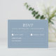 Make your wedding stationery effortlessly stylish with this modern, minimalist RSVP card in dusty blue tone. Its clean, elegant design and simple layout make it easy for guests to respond, confirm number of guests and food choices while keeping your wedding look cohesive and stylish. Perfect for couples who want a chic, classic, and minimal touch for their special day.