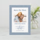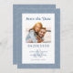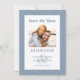 Add your custom photo to our trendy save the date photo wedding card featuring a modern abstract leaves pattern on a trendy dusty blue background. Bold calligraphy and script are in dusty blue on a white background. A trendy template complements the unique calligraphy design. A modern template for date and year complements the unique calligraphy design and the first names of the couple displayed over a coordinating ampersand. The back of the card repeats the leaf pattern on blue background. Customise with your favourite engagement photo to announce your big day! (For best placement of your picture, use a photo editing tool to centre and crop BEFORE uploading to the Zazzle website.) Be sure to see the collection link on this page to view all of the matching items! Please direct questions or custom requests to invitationsuites@gmail.com.