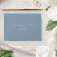 This dusty blue RSVP envelope offers a clean, elegant way to present your return address, perfectly complementing a minimalist and modern wedding suite. The refined typography and subtle script detail create a polished, stylish look that feels timeless and sophisticated. It’s the perfect finishing touch to ensure your guests’ responses arrive beautifully and are effortlessly coordinated.