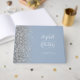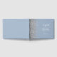 This elegant wedding guest book features a left-hand border of faux silver glitter on a dusty blue background. Easily customise the white text with the names of the bride and groom in whimsical handwriting calligraphy over a large, pale blue ampersand. Add additional text of your choice to the front and spine.