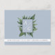 Elegant, simple, modern calligraphy dusty blue wedding save the date announcement postcard, with monogram and rustic greenery at the front.