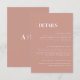 An elegant and modern dusty rose wedding details card, designed with white typography, and some arched lettering. Personalise with all your future wedding details, and initials at the back.