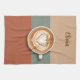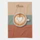 This personalized kitchen towel features a top-down perspective of a classic coffee cup with an intricate heart-shaped latte art pattern. The central image is beautifully balanced against a modern background consisting of three broad horizontal bands in earthy tones: warm tan, muted sage green, and rich terracotta.