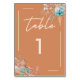 A modern and elegant earthy brown boho wedding table number card, designed with blue and brown watercolor florals, and script lettering.