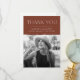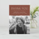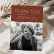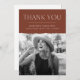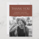 Modern graduation thank you card featuring "Thank You" at the top in white modern lettering with a brown torn edge bordering the graduate's senior photo. Personalize the photo thank you card by adding the graduate's name, school name, and graduation year. The back of the card provides space for your typed or handwritten message.