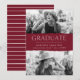 Celebrate your graduate's exciting milestone with these modern graduation announcements! The 2 photo graduation announcement features "Graduate" at the center of the design in modern white lettering and a burgundy background with torn edges. Personalize the announcement by adding the graduate's name, school name, and graduation year. The card reverses to display a textured burgundy and white striped pattern.