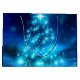 Gift bag with a modern electric blue Christmas tree. Decorated with lights all around. The background has faded blurry lights.