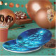 Paper plates with a modern electric blue Christmas tree. Decorated with lights all around. The background has faded blurry lights.