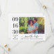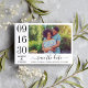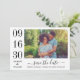 Modern and stylish wedding save the date announcement cards feature a horizontal engagement photo with a typographic design that includes bold and elegant wedding date numbers with a simple monogram of the bride and groom names. Classic black and white color scheme.