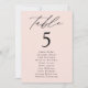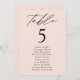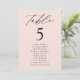 Elegant wedding seating chart featuring "table" displayed in black calligraphy script with the table number and guest names shown below on a blush background. The design repeats on the back. To order the table number seating chart, edit each card with the table number and guest names and add it to your cart. Designed to coordinate with our Modern Elegance wedding collection.
