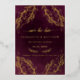 Elegant wedding save the date card design featuring real gold foil design with botanical elements on a dark burgundy red background