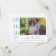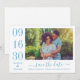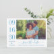 Modern and stylish wedding save the date announcement cards feature a horizontal engagement photo with a typographic design that includes bold and elegant wedding date numbers with a simple monogram of the bride and groom names. Dusty blue / steel gray blue and white color scheme.