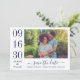 Modern and stylish wedding save the date announcement cards feature a horizontal engagement photo with a typographic design that includes bold and elegant wedding date numbers with a simple monogram of the bride and groom names. Navy blue and white color scheme.