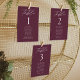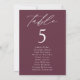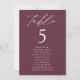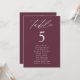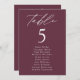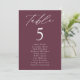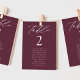Elegant wedding seating chart featuring "table" displayed in white calligraphy script with the table number and guest names shown below on a wine background. The design repeats on the back. To order the table number seating chart, edit each card with the table number and guest names and add it to your cart. Designed to coordinate with our Modern Elegance wedding collection.