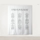 This fabric tapestry features customisable text columns where you can list your guests’ names and table numbers in a sleek, organised layout. The minimalist black typography against a crisp white background creates a timeless look that complements any wedding theme, from chic city soirées to elegant outdoor ceremonies. Lightweight and easy to hang on an easel, display frame, or wall, it’s perfect for any venue setup and also makes a beautiful keepsake long after the celebration ends.