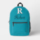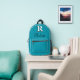 A personalised monogram backpack designed in a modern elegant style. This elegant Blue-Green backpack features a bold white initial 'R' with a black shadow and a customisable name in black script font. Perfect for adding a touch of sophistication and personalisation to your everyday style. Ideal for school, work, or casual outings, this backpack combines functionality with a chic design that stands out.