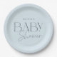 Elegant and modern baby shower paper plates in shades of light blue and dark blue-grey with custom name, modern typography and script font.