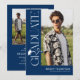 Celebrate your graduate in timeless, elegant style with this modern blue and white graduation invitation. Set against a stylish blue background, the design features trendy white serif “GRADUATE” typography running vertically down the side, creating a refined focal point. A stylish graduation cap icon sits above the “R,” while the flowing tail of the letter transforms into a sleek tassel—leading the eye to a standout photo of the graduate.
