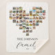 Create your own custom family photo collage sherpa blanket featuring 63 of your favourite pictures in a heart shaped photo grid style design. Personalise with family name in modern typography for a custom photo gift or home decor.