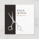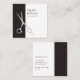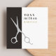 Elegant customizable business card template with FAUX silver scissors icon and dark gray/white stripes background. Modern cool design for hair salon, hairdresser, hair stylist.