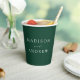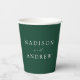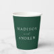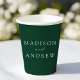 The elegant, personalised green wedding paper cups are perfect for your wedding reception, rehearsal dinner, engagement party, and more! The minimalist green wedding paper cups are perfect for summer, fall, winter, and spring weddings. The design features a chic modern calligraphy script with your names in white lettering on a dark green background. The design coordinates with our Modern Elegance Green wedding collection.