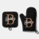Modern Elegant Monogram Name Black Gold Script Oven Mitt & Pot Holder Set