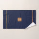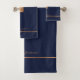 Trendy luxury exclusive looking monogrammed bath towel set featuring a faux gold copper metallic glitter square and lines over a stylish classy navy blue background. + Personalise it with your name or family name and monogram name initial.