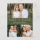 Announce your wedding date with this stylish, modern photo save the date postcard. The design features three of your favourite engagement photos with "Save the Date" displayed in white serif and script fonts against an olive green background. Personalise the front of the minimalist save the date announcements by adding your names, date, and wedding location. The save the date postcard reverses to display your return address and wedding details. The simple save the date announcement is perfect for any wedding theme.