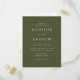 Minimalist, modern wedding invitation postcard featuring your wedding details in white lettering with calligraphy script accents. The olive green background can be changed to a colour of your choice. Personalise the back of the chic wedding invitation postcard with your return address, desired response date, wedding website, and instructions for guests using the text templates provided. Designed to coordinate with our Modern Elegance wedding collection.