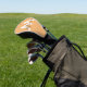 This sleek golf head cover features a clean, contemporary aesthetic with a vibrant orange colour scheme that can be customised and changed to any colour. Personalise it with your modern monogram to add a touch of individuality. Perfect for protecting your clubs in style, this head cover combines functionality with a chic design, making it a versatile addition to your golf accessories. The neutral tones ensure it complements any gear while standing out with its unique, personalised touch.