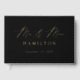 Elegant wedding guestbook featuring "Mr. and Mrs." displayed in a modern gold foil calligraphy script on a black background. Personalise the front of the simple wedding guest book with your last name and wedding date. Add your married name and wedding date to the spine of the photo guest book. The back of the black and gold foil guest book displays your horizontal engagement photo.