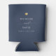 Modern wedding party favour can cooler with your custom names in elegant swirly script calligraphy, the couple's names and the date of your celebration. This is the minimalist dusty blue version with a golden heart detail. Great also for bridal showers, engagement or bachelorette parties.