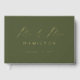 Elegant wedding guestbook featuring "Mr. and Mrs." displayed in a modern gold foil calligraphy script with an olive green background. Personalise the front of the simple wedding guest book with your last name and wedding date. Add your married name and wedding date to the spine of the photo guest book. The back of the olive green and gold foil guest book displays your horizontal engagement photo.