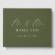 Elegant wedding guestbook featuring "Mr. and Mrs." displayed in a modern white calligraphy script on an olive green background. Personalise the front of the simple wedding guest book with your last name and wedding date. The back of the olive green guest book displays your horizontal engagement photo. Add your married name and wedding date to the spine of the photo guest book.