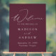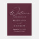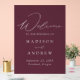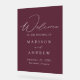 Elegant wedding welcome acrylic sign featuring "Welcome" in a modern white calligraphy script with a purple acrylic background. Personalise the purple wedding sign by adding your names, wedding date, and wedding location. The vertical welcome sign is designed to coordinate with our Modern Elegance wedding collection and is available in other colours/style options.