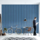 The design showcases sophisticated wide stripes in shades of dusty blue arranged vertically.