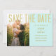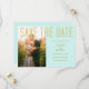 Unique wedding photo Save The Date. Light mint (turquoise) background. Gold lettering (gold is not real gold but colour). Modern streamlined font. Truly unique, simple, and elegant. For summer wedding, spring wedding, or any kind of modern elegant wedding.