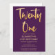 Introducing a new modern, elegant 21st birthday party invitation simple plum purple background with gold handwritten typography text "twenty one". Customise this template card by adding your own party information.