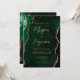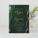 This elegant wedding invitation features a background image of emerald green watercolor agate trimmed with faux gold glitter. The customisable text combines gold-coloured modern handwriting, copperplate and italic fonts. The reverse side provides space for wedding details on a matching green agate background, along with a QR code guests can scan to visit your website and RSVP, which saves the cost of printing and mailing separate RSVP cards.