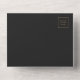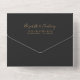 The left-hand edge of this elegant modern all-in-one wedding invitation and RSVP features an emerald green watercolor agate border trimmed with faux gold glitter. The customisable text combines gold-coloured whimsical handwriting script, copperplate and italic fonts on a slate black background. The return address appears on the outside flap and the reverse side of the detachable RSVP card in gold-coloured text on solid slate black.