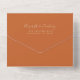 The left-hand edge of this elegant modern all-in-one wedding invitation and RSVP features an emerald green watercolor agate border trimmed with faux gold glitter. The customisable text combines gold-coloured whimsical handwriting script, copperplate and italic fonts on a burnt orange or rust background.