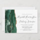The left-hand edge of this elegant modern wedding invitation features an emerald green watercolor agate border trimmed with faux gold glitter. The customisable text combines handwriting, copperplate and italic fonts in charcoal grey on a white background. The reverse side features a matching emerald green and gold agate design.