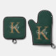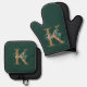 Modern Emerald Green Gold Monogram Script Oven Mitt & Pot Holder Set