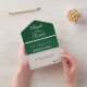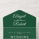 Modern emerald green and white typography and small flowers all in one fall wedding invitation. It displays your names in a cursive script elegant style typography and two small white flowers with leaves on both sides of the ampersand on emerald green. The RSVP can be detached.