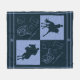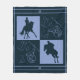 A bold and modern equestrian design in midnight blue and hydrangea blue featuring the silhouettes of a dressage and a showjumping horse with riders juxtaposed with equestrian tacks such as a saddle, a whip, riding boots, a helmet, and a horseshoe. Personalise the fleece blanket with your monogram or initials and make it uniquely yours. This is a great home decor item for a horse lover or an avid equestrian.