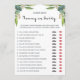 Before the baby shower, ask the mummy and daddy-to-be the questions listed on the gender neutral game sheet with eucalyptus leaves and write down their answers. Who suggested the baby’s name? Who will teach baby to dance? Who will be more patient?